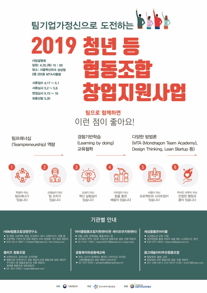 HBM협동조합경영연구소가 한국사회적기업진흥원과 함께 2019년 「청년 등 협동조합 창업지원 사업」 에 참여합니다.