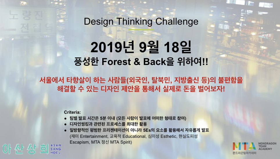 지난 파주 Forest & Back 에서는 아산상회에 NEXT꾼과 티키타카 라는 두 개의 팀 커퍼니가 탄생하는 빅 이슈가 있었습니다. 그런데 잠깐만요. 팀 컴퍼니가 본격적으로 시작하기 전에 마무리해야 할 것이 있었죠. 바로 디자인 씽킹 Design Thinking 프로젝트인데요. '서울에서 타향살이하는 사람들의 불편함을 해결할 수 있는 디자인 제안을 통해서 실제로 돈을 벌어보자!' 라는 도전과제로 2주 동안 네 팀이 프로젝트를 진행했었죠. 헤이그라운드에서 테크스타스 Techstars 의 오코와 랄리타에게 피칭 Pitching 을 해보기도 했구요. 네 팀의 디자인씽킹 프로젝트는 어떻게 발전하고 어떻게 마무리 되었을까요?