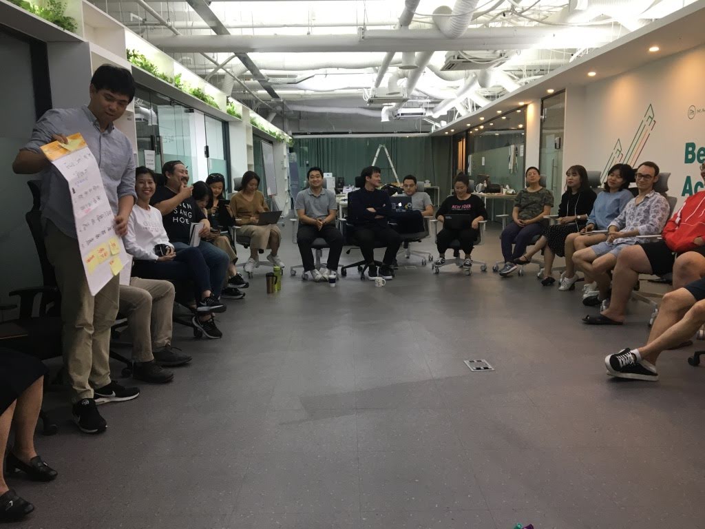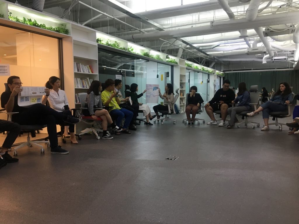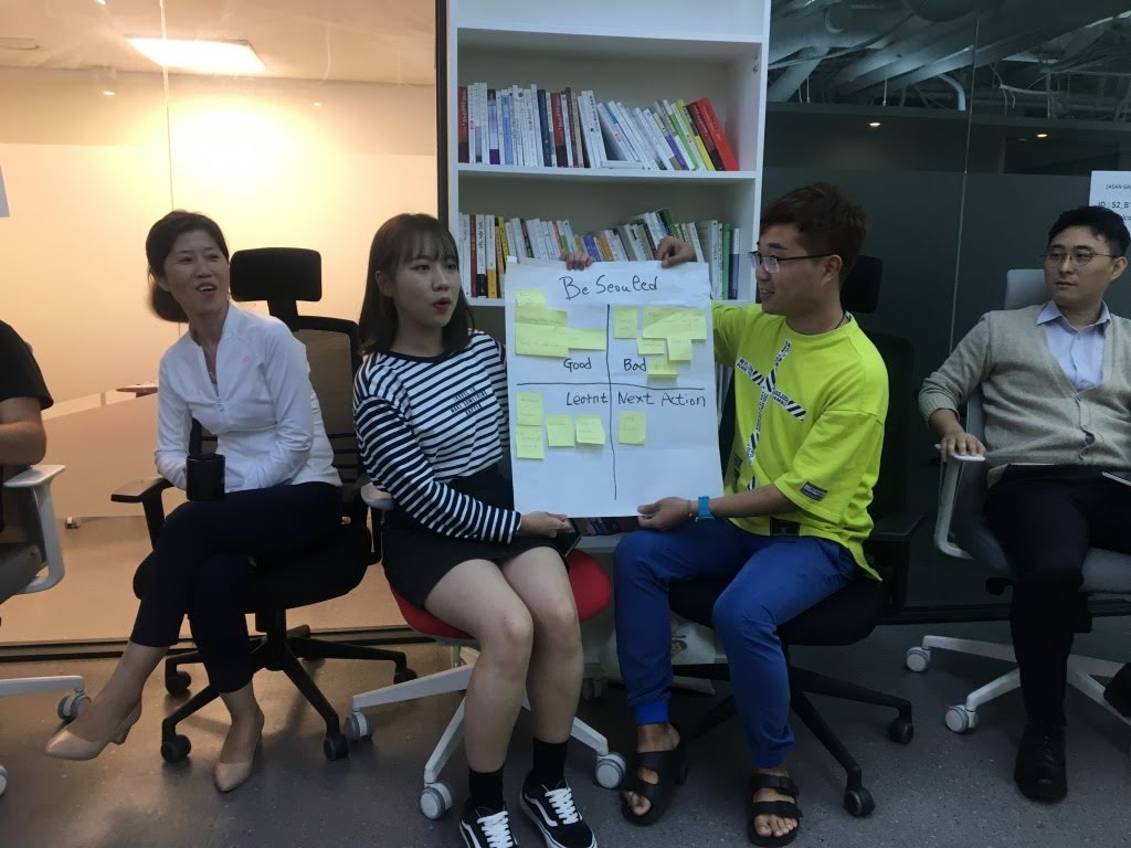 네 팀의 디자인씽킹 발표를 마쳤다면 포스트 모토롤라 Post Motorola 로 서로의 배움을 공유하는 시간이 빠질 수 없겠죠. 팀 별로 좋았던 점, 아쉬운 점, 배운 점, 적용할 점을 나누면서 서로를 통해 학습합니다.